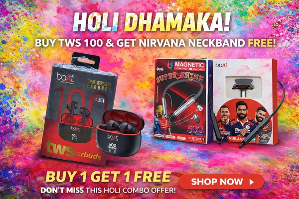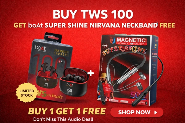 Upgrade your audio experience with this exclusive Buy 1 Get 1 FREE combo offer! Get the powerful boAt TWS 100 True Wireless Earbuds and receive a boAt Super Shine Nirvana Neckband absolutely FREE.