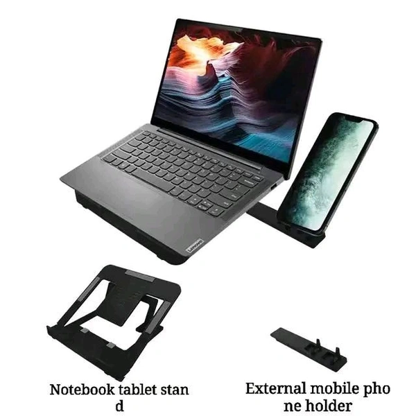 - Dual Stand Functionality: Comes with both a laptop stand and an external mobile phone holder, keeping all your essential devices within easy reach.