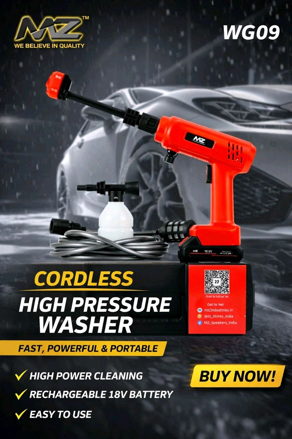 Make cleaning faster and easier with the MZ WG09 Cordless High Pressure Washer. Designed for powerful and portable performance, this washer features a rechargeable 18V battery that allows you to clean anywhere without needing a direct power connection.
