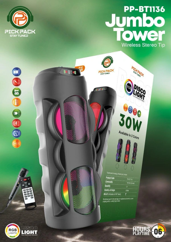PP-BT1136(PORTABLE BLUETOOTH JUMBO TOWER SPEAKER) solid base Sound with High Bass 30 W Bluetooth Speaker.